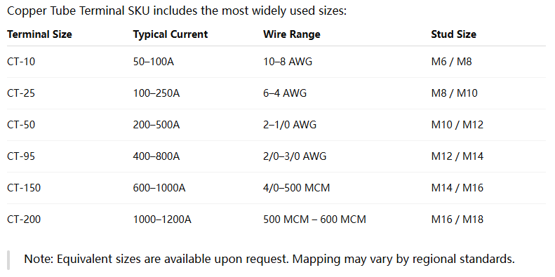 This SKU consolidates the most commonly used copper tube terminal sizes into a single standardized offering, covering currents from 50A to 1200A for typical ESS and industrial wiring applications.