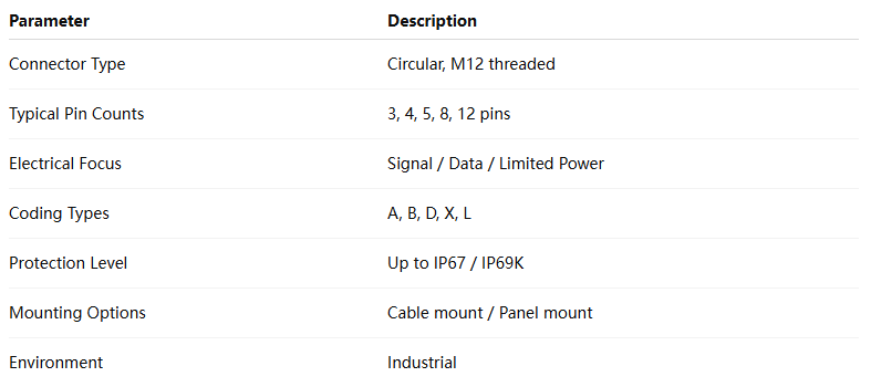 Due to its balance of size, performance, and availability, M12 has become the most commonly used circular connector in modern industrial systems.