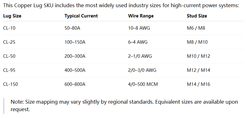 This SKU consolidates the most commonly used closed type copper lug sizes into a single standardized offering, covering the real-world current range from 50A to 800A.