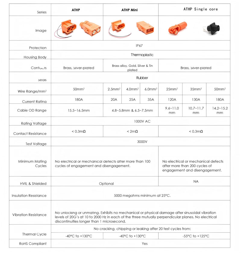 RADSOK® contact technology. The ATHP series is designed for a variety of "xEV" and energy storage applications, IP67, single core or two rated current from 20A to 180A