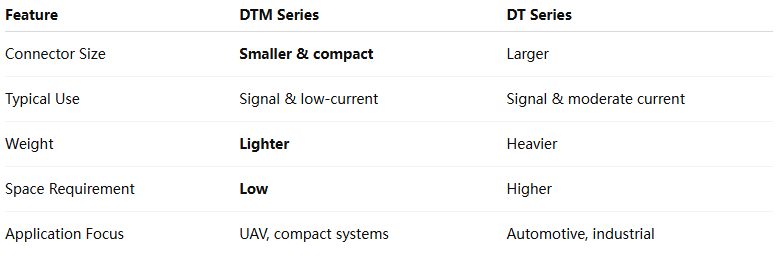 The DEUTSCH DTM Series is a compact sealed connector solution designed for applications where space, weight, and reliability are critical. Compared with standard DT connectors, the DTM Series offers a smaller form factor while maintaining excellent sealing and vibration resistance. DTM connectors are widely used in UAVs, robotics, compact industrial equipment, and electronic control systems.