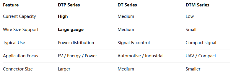 The DEUTSCH DTP Series is a high-current sealed connector solution designed for applications that require reliable power transmission in harsh environments. Compared with DT and DTM series, DTP connectors support larger wire sizes and higher current loads, making them ideal for power distribution systems. DTP Series connectors are widely used in EV systems, energy storage equipment, and indust